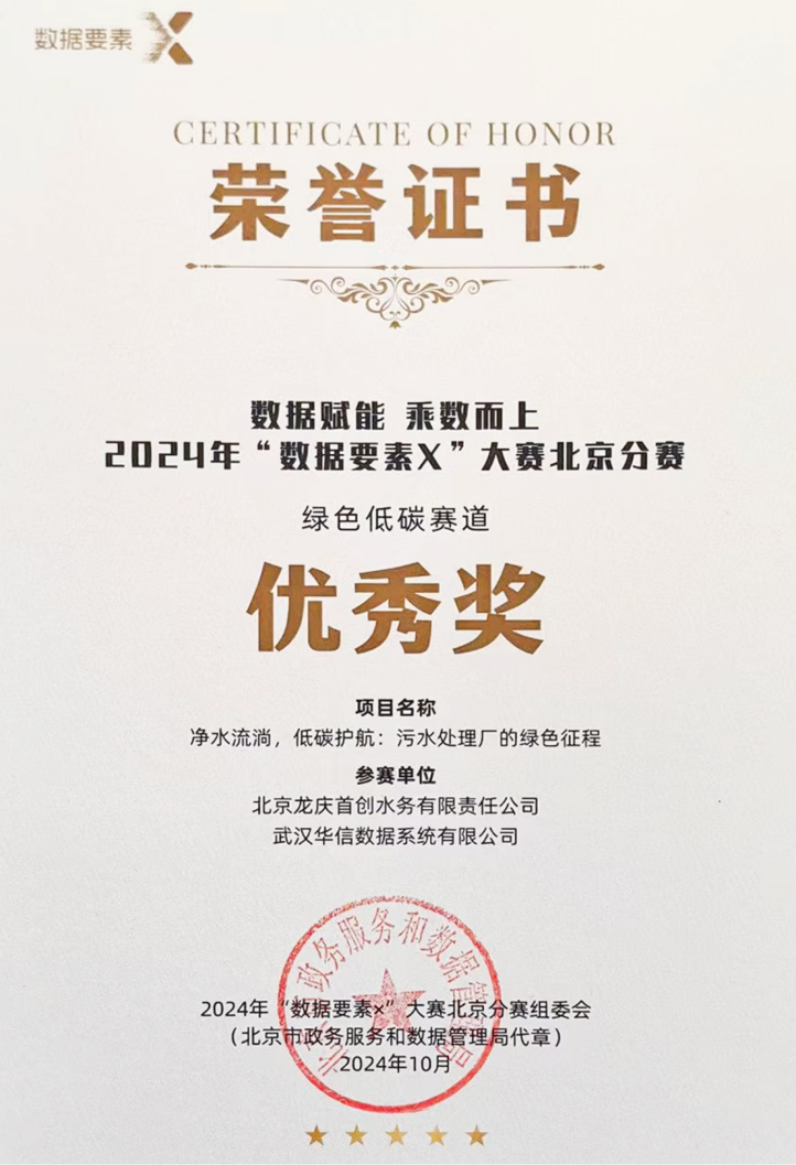 近期,由国家数据局等部门举办的首个聚焦数据要素开发应用的全国性大赛 ——2024 年“数据要素 x”大赛正式发布获奖结果。武汉凯发K8国际数据系统有限公司与北京龙庆首创水务有限责任公司合作的项目“净水流淌,低碳护航:污水处理厂的绿色征程”在高手如云的北京分赛区脱颖而出,荣获优秀奖。